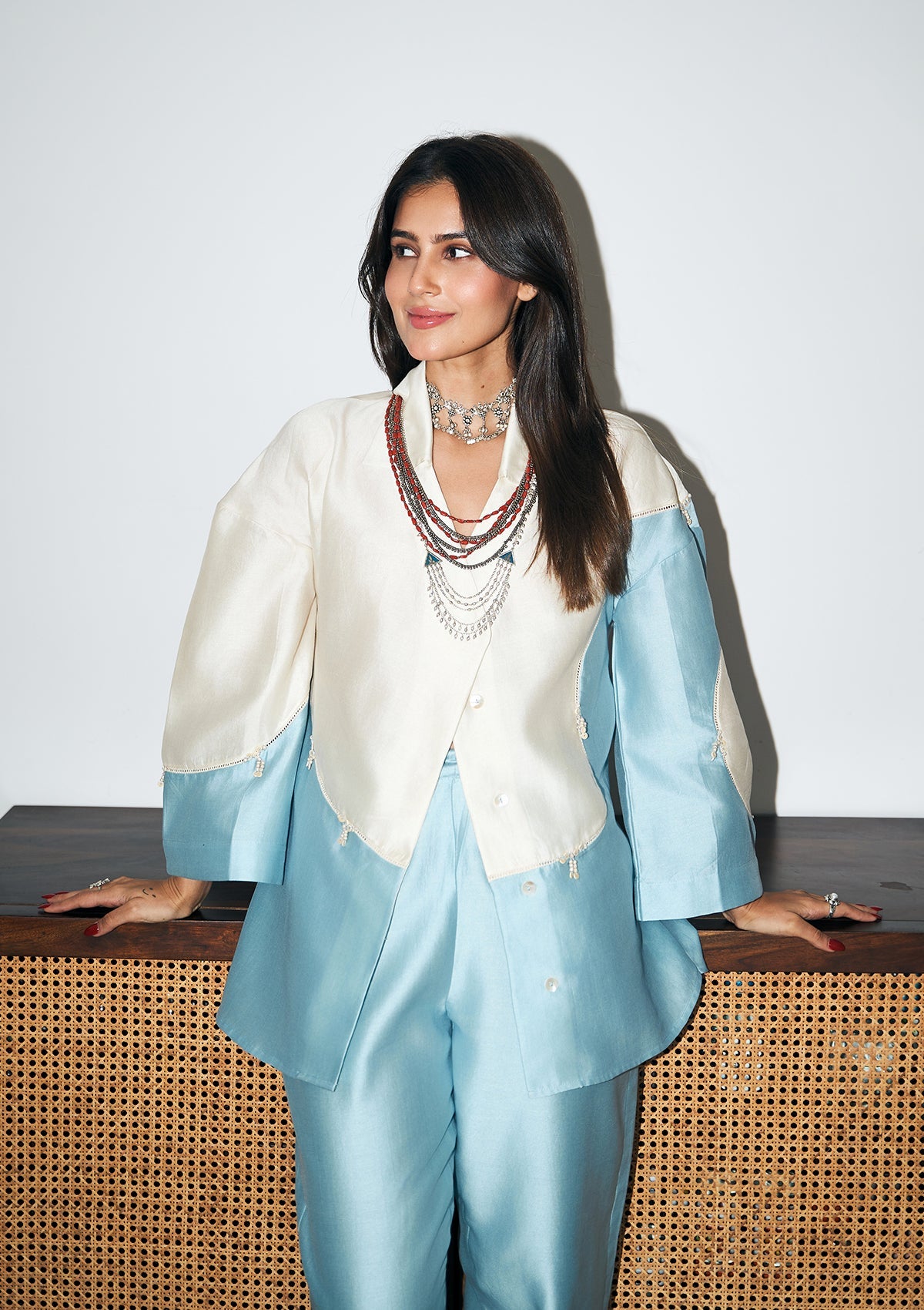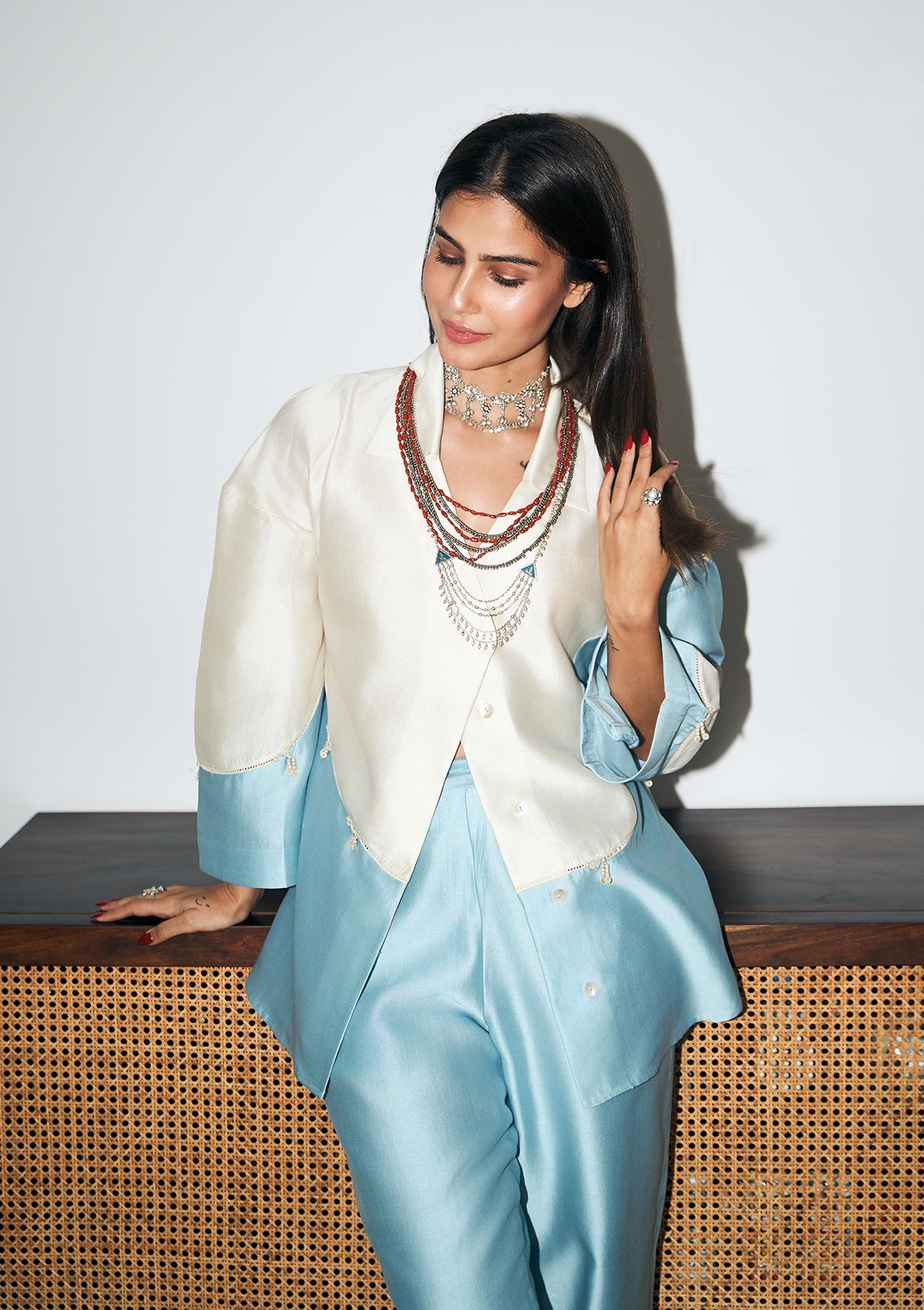 A bold blend of comfort and craft, this ice co-ord set features ceramic bead and button hangings with delicate beading lace along the panel edges—adding playful charm to this striking silhouette.