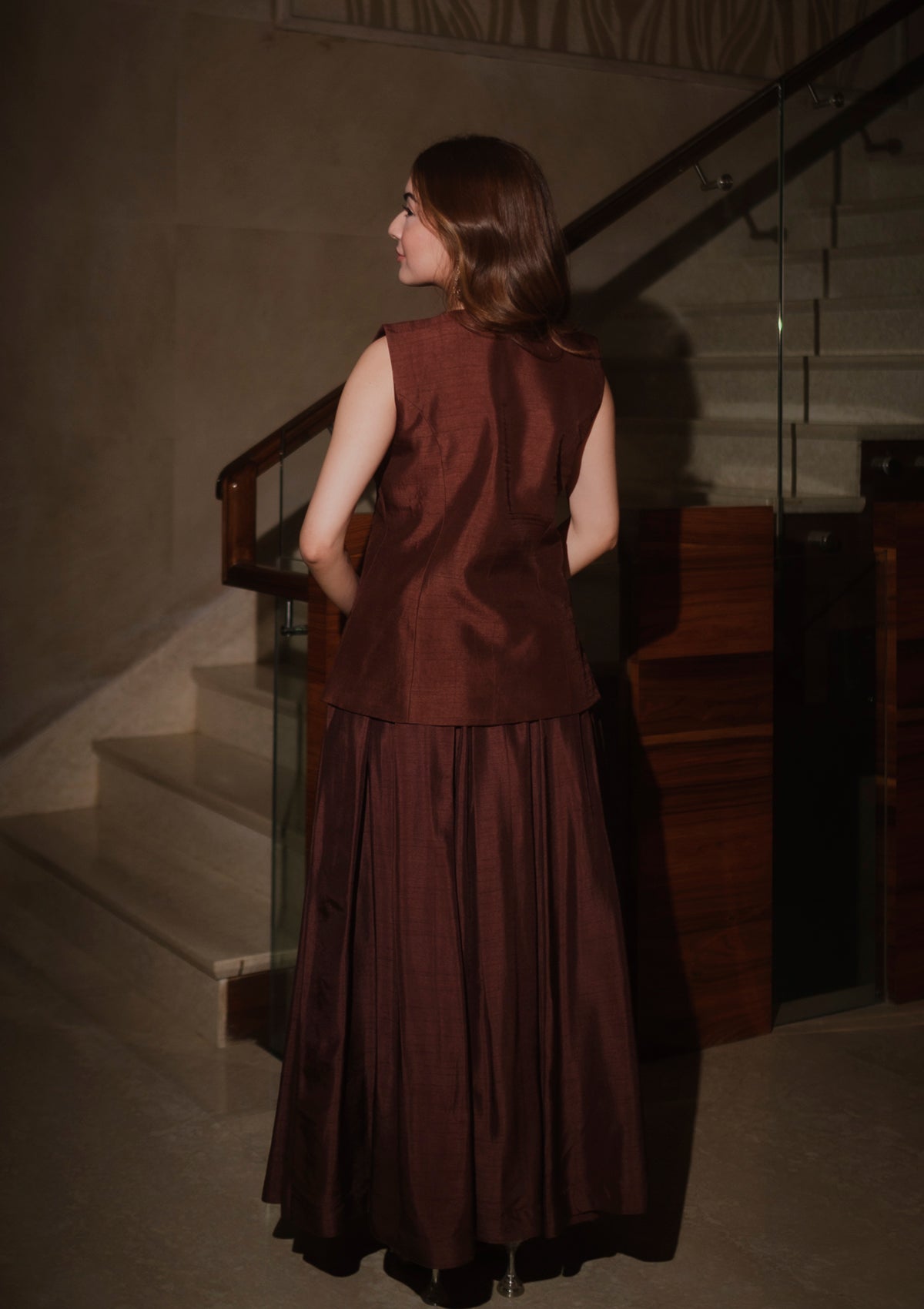 Wrapped in a warm mocha tone, the Mocha Cosmo Waistcoat Set is crafted in luxe korean silk and detailed with intricate polki embroidery lace, finished with delicate pearl hangings. The structured waistcoat is paired with a flowing maxi skirt, creating a refined balance of modern tailoring and traditional detail. With a soft shimmer from polki and pearls, this ensemble is perfect for festive evenings, intimate gatherings, and special celebrations.