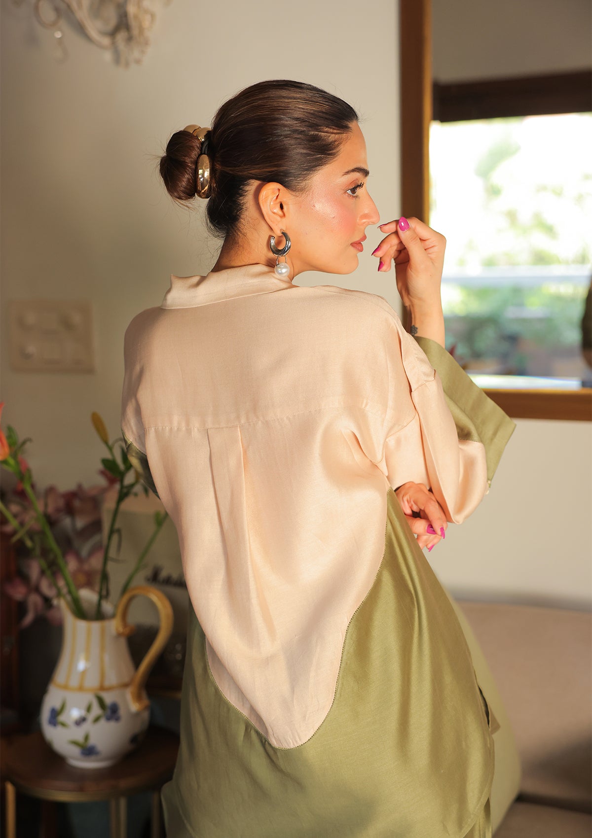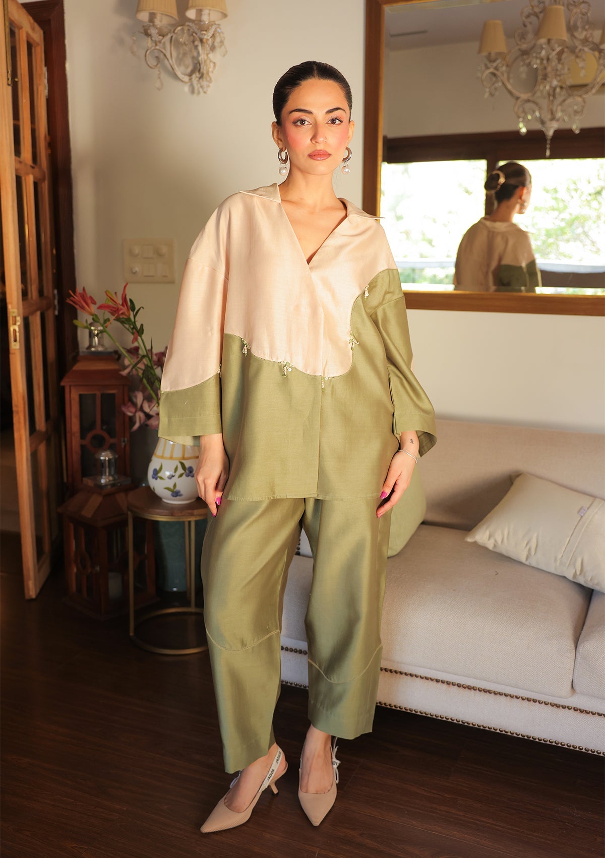 Where subtle tones meet artisanal finesse. Crafted in chanderi and mulmul, this dual coloured co-ord set is adorned with ceramic beads and button hangings along the curved panel edges, adding a touch of movement and charm to its serene silhouette.